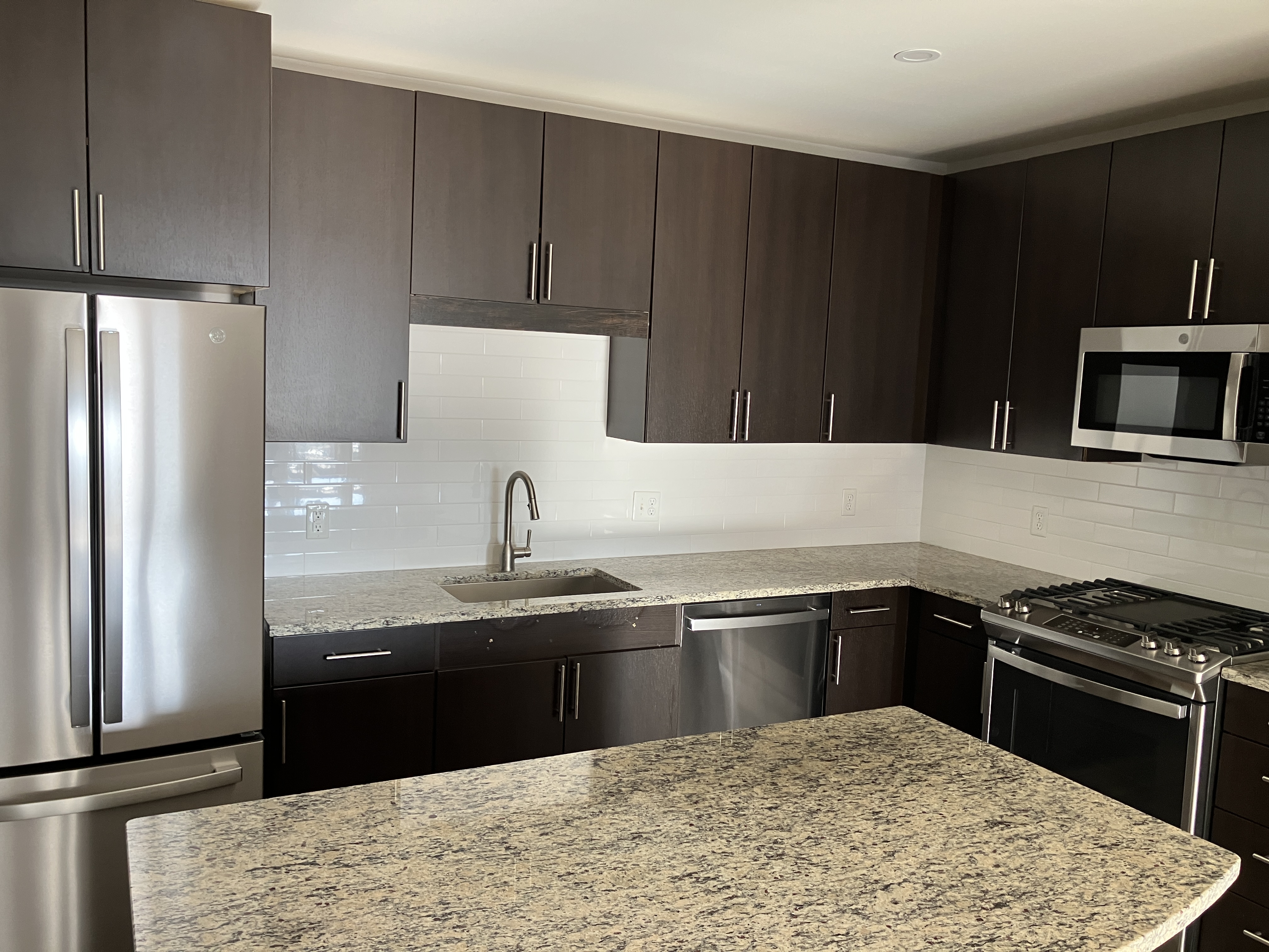 ●キッチンは高級感のある御影石のカウンタートップ。冷蔵庫・ガスコンロ・オーブン・電子レンジ・食洗機が最初からついております。