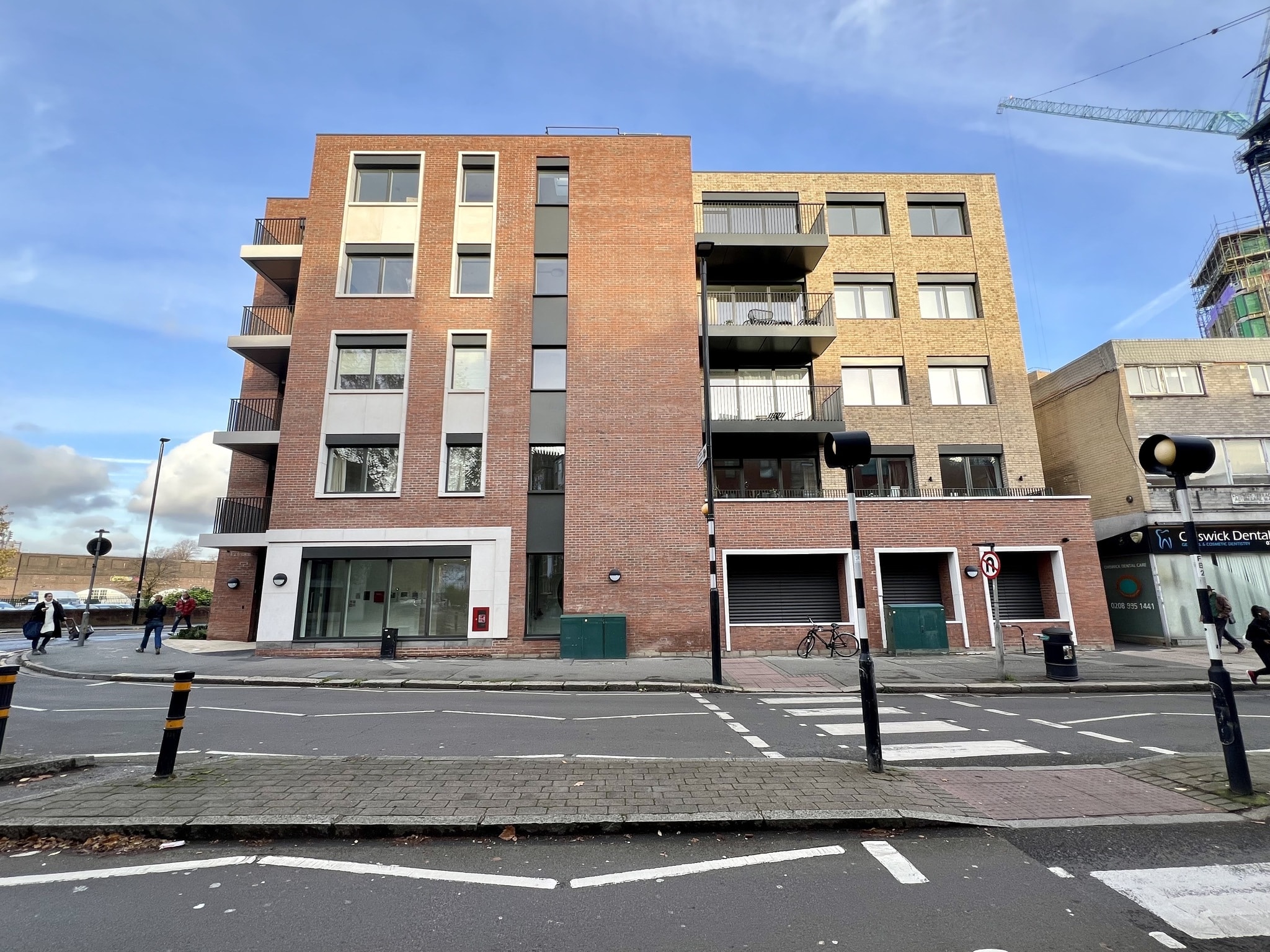 Chiswick Park駅より徒歩約1分に位置する新築のパーパスビルトフラット。歩いてすぐの距離にスーパーが2つ(Sainsbury'sとWaitrose)あるためお買い物に非常に便利なエリア。