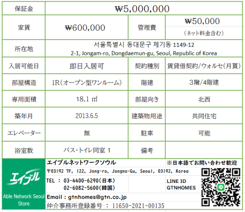 韓国の物件は流動的なため、空き確認が出来ない物件につきましてはお客様の希望に合わせた類似物件をご紹介させていただきます。そのため掲載されている物件は、参考物件としてご覧ください。