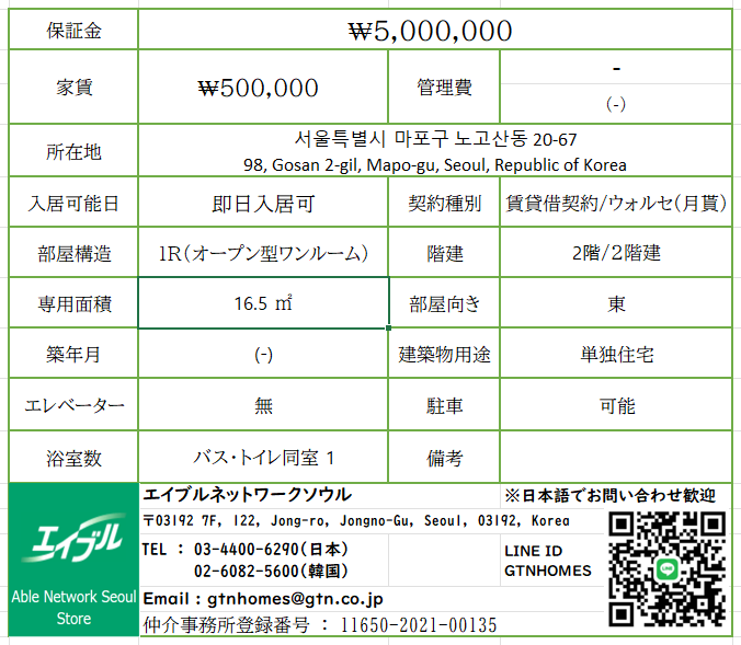 | 賃料 | ₩ 500,000 /月 |