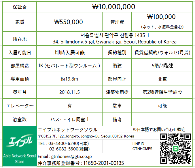 | 賃料 | ₩ 550,000 /月 |