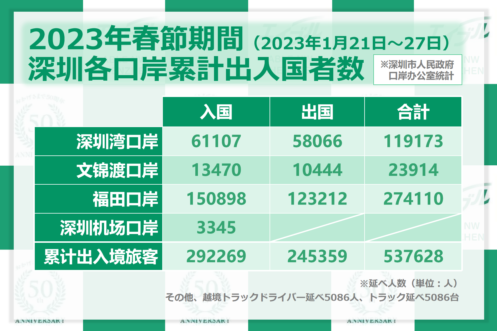 2023年の春節期間中、深圳各口岸の出入国者数はピークを迎え続けました。深圳市口岸がまとめた統計データによりますと、2023年1月21日から27日までに、深圳各口岸の出入国旅客は延べ537628人(入国292269人、出国245359人)で、そのうち深圳湾口岸の出入国者は延べ61107人、出国者は延べ58066人、文錦渡口岸では延べ13470人が入国し、延べ10444人が出国しました。福田口岸からの入国者は延べ150898人、出国者は延べ123212人、深圳空港の口岸からは延べ3345人が入国しました。また、越境トラックの運転手は累計5086人、トラックは5086台入国しました。